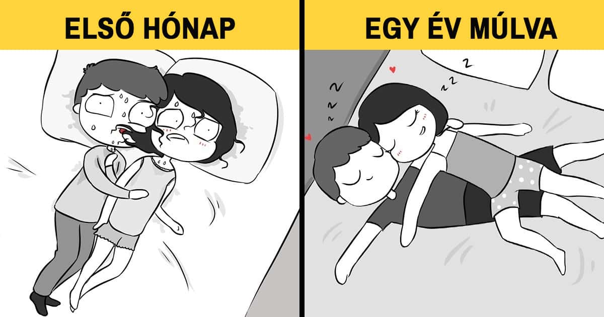 12 illusztráció, amely bemutatja, hogyan változik meg a párkapcsolat 1 hónap és 1 év után